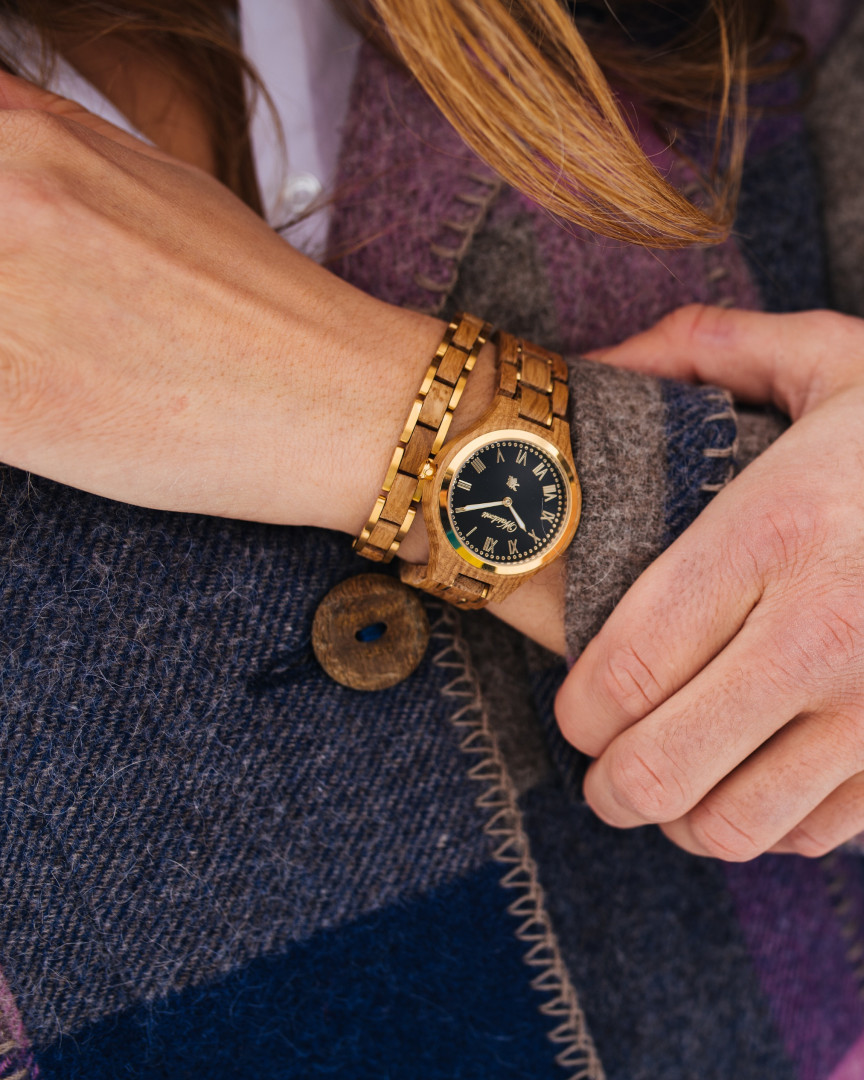 Set: Damenuhr Weinprinzessin Noir + Elementarmband Damen Barrique Gold