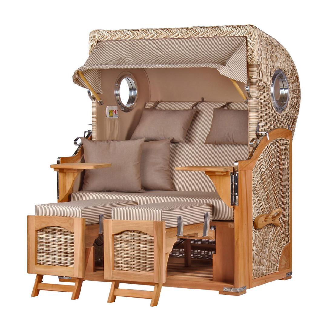 Der Strandkorb Düne ist ein eleganter Zweisitzer für Terrasse oder Garten und verbindet Teakholz mit einem hochwertigen PE-Geflecht in „Shell“. Die geschwungene Form orientiert sich am klassischen Ostsee-Stil und sorgt für eine zeitlose Optik. Dank Vollieger-Funktion, extra dicker Polsterung und ausziehbarer Fußstützen bietet das Modell hohen Sitz- und Liegekomfort. Die Ausstattung mit Schwenktischen und Zeitungstaschen schafft praktische Ablageflächen, während die innenliegende Windschutzfolie den Innenraum zusätzlich vor Nässe und Verschmutzungen schützt. Optional ermöglicht ein Lifter-System die komfortable Verstellung des Oberkorbs.
